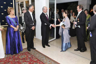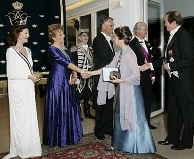 SS.AA.RR., Dom Duarte de Bragança e Dona Isabel de Bragança na sessão de cumprimentos que precedeu o jantar de Gala oferecido pelos Reis da Suécia, Carlos Gustavo e Sílvia, no âmbito da visita de Estado que realizaram a Portugal entre 5 e 7 de Maio.