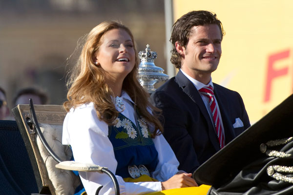 À noite, a família real viajou numa carruagem no parque Skansen para participar numa celebração em homenagem à festa nacional.